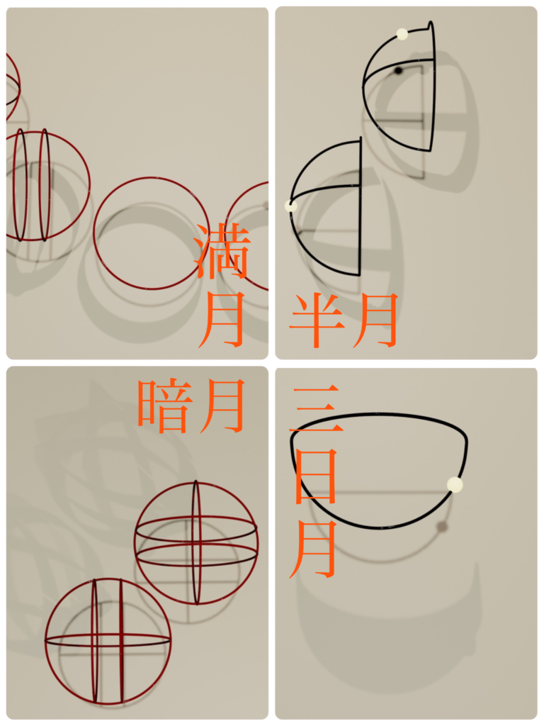 月影とは、浮遊する物体の影に映った形のことを指します 種類は(満月、半月、三日月、暗月)の4種類 ※もしくは無月を加えた5種類 ワードによっては、この4種類(満月、半月、三日月、暗月)に分類できない形の物もあります その場合は、月影判定無し(無月)にしてもいいですし、 すこし満月や半月、三日月にみえる形もあるので、(ナヤ→半月 コト→満月 アウノ→三日月) そのへんは各々でルールを設定してみてください。 満月 (マワリテ、カタチ、ハハ) 半月 (ヒフミ、ヨイ、ム) 三日月 (メクル、ス、ヘシレ) 暗月 (サキ) 無月 月影判定無し (ナヤ、コト、アウノ)
